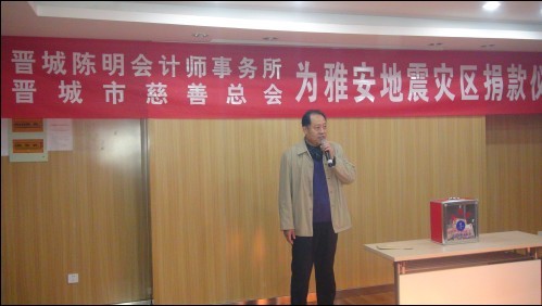 2013年4月28日下午三時,陳明集團會議室里愛意濃濃,正在舉行為雅安地震捐款獻愛心活動,此次捐款活動我們有幸請到了晉城市慈善總會陳副會長光臨并作了重要講話,表示一定將陳明集團全體員工的愛心送到雅安同胞手上。